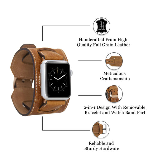This Apple watch cuff band offers 2-in-one design which is merged to create a classy look around your wrist. You can use this leather watch band with or without the cuff band. While the leather strap without the cuff band presents an elegant and classy look around your wrist, it reflects a rugged appearance with its cuff band.