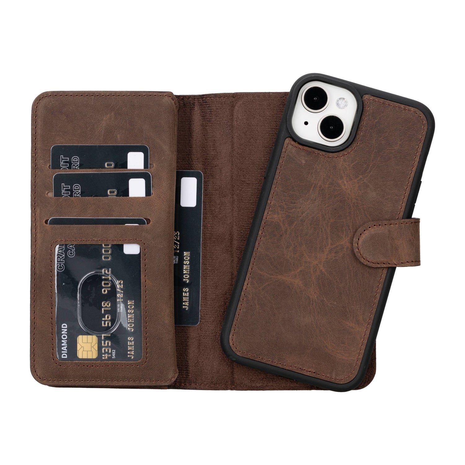 The iPhone 15 Plus Dual Leather Wallet Case features: