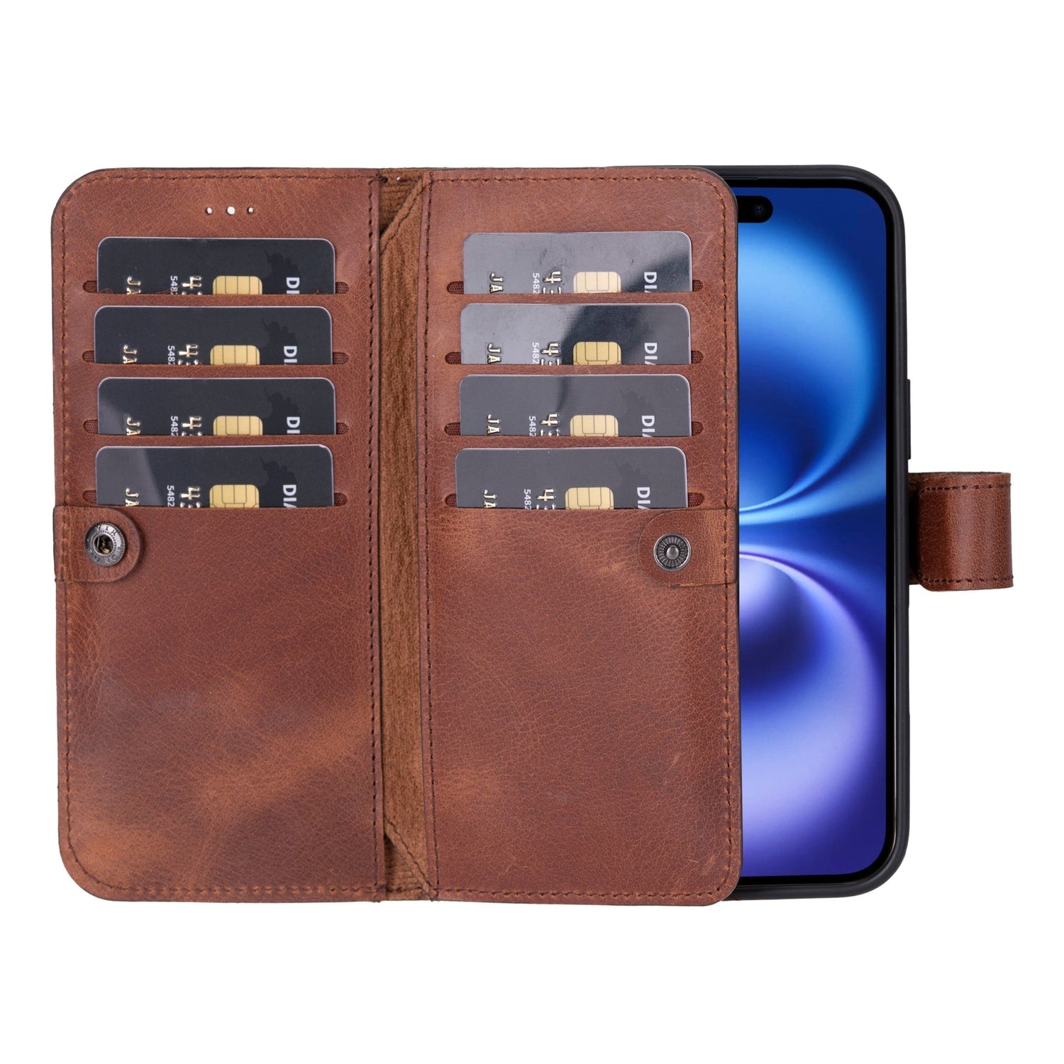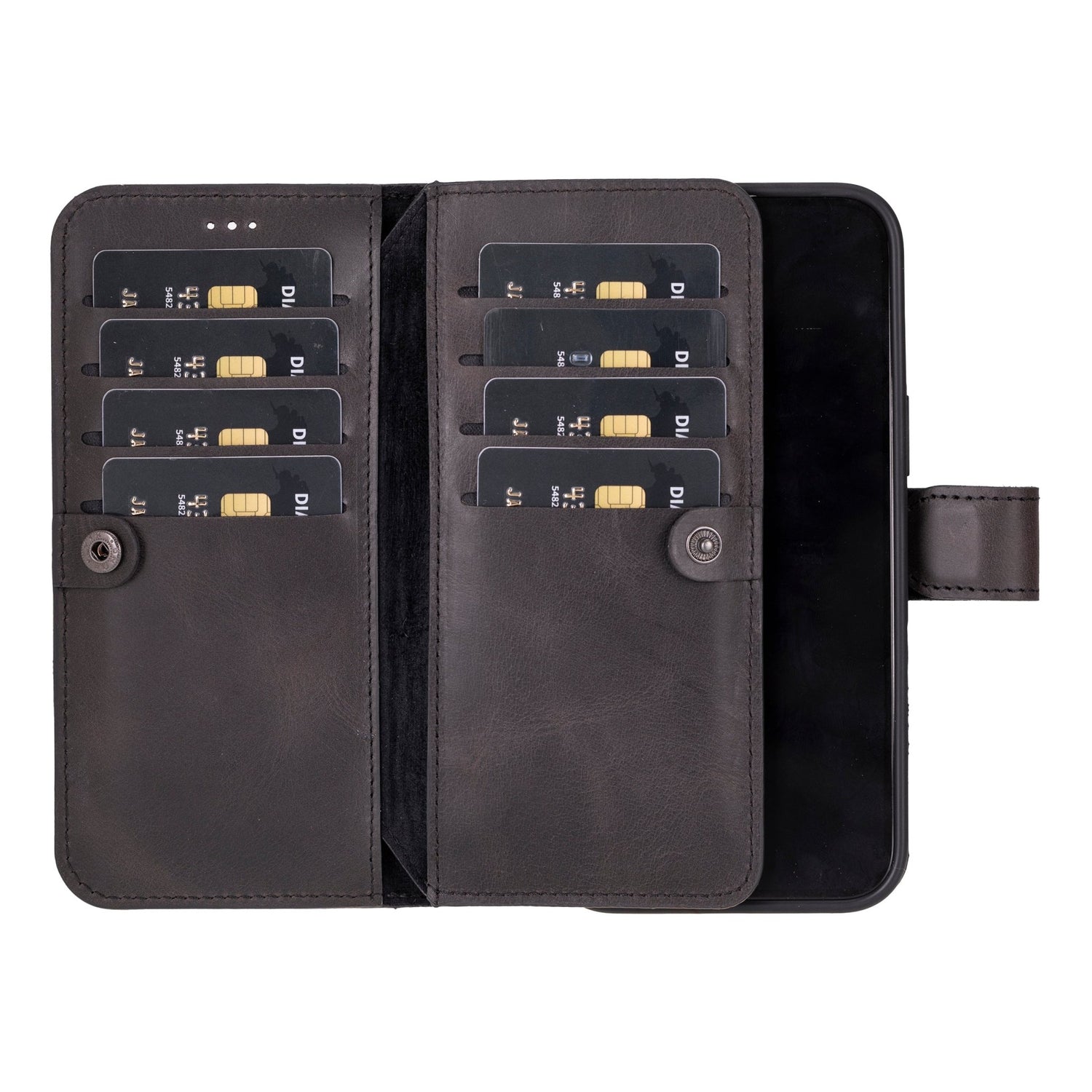 Compact, versatile and exclusive design! The iPhone 16 Plus Leather Dual Wallet Case combines your wallet with your phone case. Meticulously handcrafted with premium leather, it allows you to store your iPhone 16 Plus, cards, and cash in one secure and easy-to-carry case.