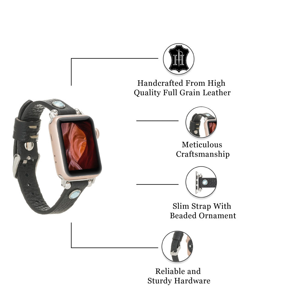 Slim Beady Leather Band for Apple Watch is sleek minimalist design, slim, narrow and simple style. Beautifully made by skilled and experienced leather artisans using high quality leather. Chic metal bead at both ends.