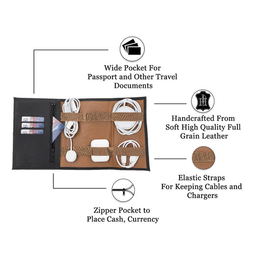 Greatly functional, simply practical, absolutely gorgeous. Boasts top quality leather and superb craftsmanship. Holds and organize your cords, cables, chargers and power banks safe and secure on the go.