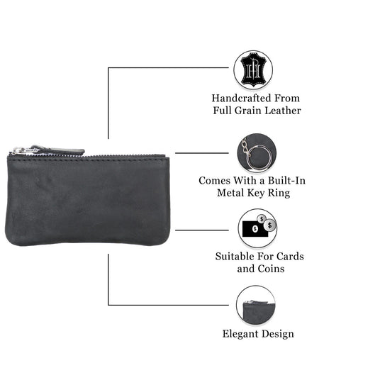 Compact, practical, well made. Handcrafted from high quality leather. Can hold coins, receipts or even cards. Comes with a strong keychain to attach car or house keys.